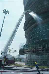 起火位置火勢(shì)一度猛烈,滾滾黑煙從地盤涌出街外,直卷半空,遠(yuǎn)至立法會(huì)大樓也可清楚看見(jiàn),狀甚嚇人。事發(fā)于16日下午1時(shí)許,大批消防員、救護(hù)員及治安警接報(bào)趕抵現(xiàn)場(chǎng),消防員到場(chǎng)即在亞馬喇圓形地近舊澳氹大橋口升起云梯向著火的棚架及安全網(wǎng)射水撲救,防止火勢(shì)蔓延。