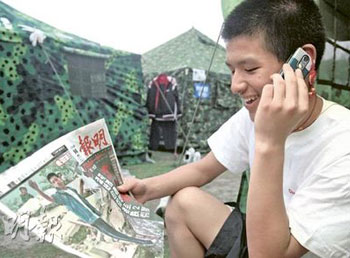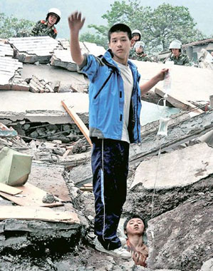 中新網(wǎng)5月22日電 據(jù)香港明報報道,地震災區(qū)無數(shù)震撼人心的真實故事分分秒秒上演,5月14日《明報》頭版照片在讀者中引起了極大震撼。該報記者特意深入地震災區(qū),查訪兩名相中人的下落,21日終于在綿陽找到兩名北川中學高一學生——手托鹽水瓶協(xié)助救人的李陽,和被埋在瓦礫下的廖波。
