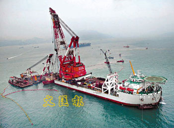資料圖:由中國(guó)交通部廣州打撈局派出的大型打撈船“華天龍”,在香港水域小磨刀東面,成功將沉沒(méi)的烏克蘭補(bǔ)給船的煙囪及駕駛艙部份吊出水面。 中新社發(fā) 鄧慶樂(lè) 攝