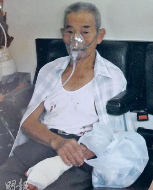 年邁的陳父左手腕受傷,在場接受包扎后送院治理。(圖片來源:明報)