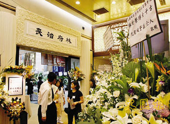 林世榮的靈堂,以金黃的慧蘭和白色百合花布置,遺孀與3名子女致送給亡夫亡父的心形花牌,花牌由黃色玫瑰造成,放于靈前當眼處。而靈堂的橫匾,寫著“往生凈土”,左右兩側掛上大挽聯“世人贊頌一代商才,恒豐盛業(yè)傳永世”,“榮澤綿延千秋遺愛,至尊美譽葆長榮”。