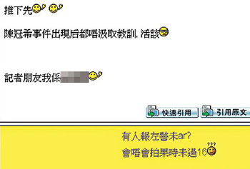 年初的陳冠希艷照門事件引起社會嘩然,各界關(guān)注網(wǎng)上色情資訊的監(jiān)察問題。香港互聯(lián)網(wǎng)協(xié)會主席莫乃光說,會方曾向?qū)W生派發(fā)互聯(lián)網(wǎng)使用守則,但一般網(wǎng)民的行為則難以控制:“其實陳冠希事件前后,網(wǎng)上一直都有性愛片段流傳,重點(diǎn)是有沒有人因此受害!彼f,所謂淫褻資訊的監(jiān)察,存在基本上的困難,因為某些網(wǎng)上論壇的成立,根本就是以成人話題為主,很難要求主持人刪去這些資訊。