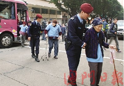 有人報警求助,多名警員到場調(diào)查。由于旅游巴上的14名長者行動不便,要在安老院人員和警員攙扶到另一大巴,有長者更需乘坐輪椅。