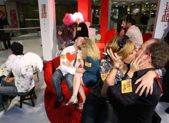 倒計(jì)時(shí)開始了。在浪漫的樂聲中,五對(duì)情侶旁若無人地?fù)砦瞧饋。?jīng)過一輪激吻,來自美國的Sean和女友Megan獲得“最多咀大獎(jiǎng)”,在2分14秒中吻了282次。而來自英國的Adam和意大利女友Nicole獲得“最美一吻大獎(jiǎng)”。