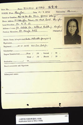 這次展覽的多數(shù)展品,是由宋以朗先生提供,如有張愛(ài)玲親筆簽名的《傾城之戀》等著作以及《談色.戒》初稿。“初稿”表露張愛(ài)玲回應(yīng)刊于當(dāng)年臺(tái)灣《中國(guó)時(shí)報(bào)》內(nèi)署名“域外人”對(duì)《色.戒》的批評(píng)。是次展覧,香港大學(xué)則展示了張愛(ài)玲的入學(xué)證明,上面附有她戴著圓厚眼鏡的學(xué)生照。但上面的出生日期為九月十九日,與后來(lái)她申請(qǐng)美國(guó)綠卡時(shí)所填的九月三十日不同。