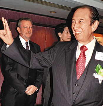 贏了官司,何鴻燊向記者舉起勝利手勢(shì)。(圖片來(lái)源:文匯報(bào))