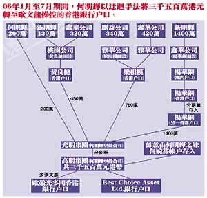 在最初階段,何明輝涉向歐文龍行賄時(shí),一般只是透過新明輝的二判商、公司職員或何明輝妹妹何婉芬,經(jīng)一兩層清洗后,賄款已去到由歐文龍所操控的香港銀行賬戶內(nèi)。自○五年九至十一月期間,何明輝涉向歐文龍交付一筆三千一百多萬(wàn)港元款項(xiàng)時(shí),過程開始轉(zhuǎn)趨迂回復(fù)雜。何明輝先將賄款轉(zhuǎn)入旗下二判商后,再由新明輝經(jīng)理?xiàng)钊A鋼所開設(shè)鑫華公司收集賄款,由楊華鋼本人賬戶多次匯款后,方去到歐文龍操控的Ecoline Property Limited香港銀行賬戶。