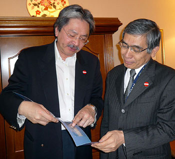 香港財政司司長曾俊華(左)在墨爾本,與亞洲開發(fā)銀行總裁Haruhiko Kuroda進行雙邊會議,并致送紀念品。(圖片來源:香港特區(qū)政府網站)