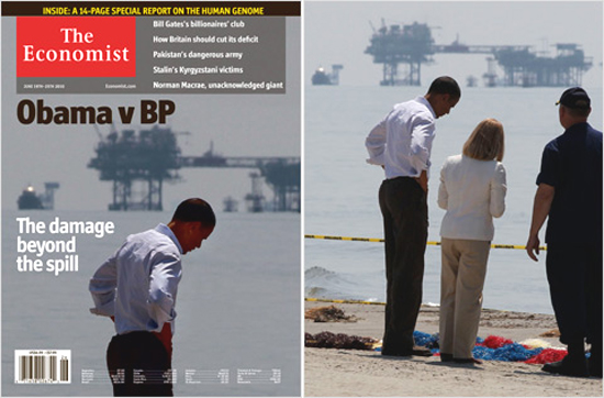 據(jù)美國(guó)《紐約時(shí)報(bào)》和《赫芬頓郵報(bào)》消息,5月28日出版的英國(guó)著名雜志《經(jīng)濟(jì)學(xué)人》,其封面故事是奧巴馬與墨西哥灣漏油事故。日前該雜志遭到美國(guó)方面的聲討和譴責(zé),原因是雜志在封面圖片中對(duì)奧巴馬的一張照片進(jìn)行了改動(dòng),使其看起來(lái)孤獨(dú)、無(wú)助。
