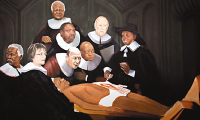 該幅油畫出自當(dāng)?shù)厮囆g(shù)家達馬素,是17世紀(jì)著名畫家林布蘭描繪12歲艾滋病斗士恩科西-約翰遜的《杜爾博士的解剖學(xué)課》現(xiàn)代版。