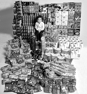 12日,英國媒體刊登了一份英國食品標準機構(gòu)和營養(yǎng)調(diào)查機構(gòu)共同統(tǒng)計的數(shù)據(jù),數(shù)據(jù)統(tǒng)計了4到10歲兒童平均每人一年內(nèi)所食用的包括蛋糕、冰激凌等在內(nèi)的“垃圾食品”的數(shù)量,并將所有這些放在一起拍了張照片。據(jù)統(tǒng)計每名兒童一年平均吃5840克餅干、8030克蛋糕、4380克奶酪、5840克冰激凌等。(綜合)