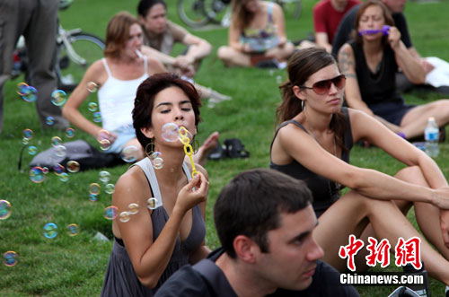 中新社多倫多7月17日電 (記者 賴海隆)數(shù)百名攜帶吹氣泡用品的抗議者17日正午時(shí)分在多倫多皇后公園里同時(shí)吹出氣泡,以表達(dá)對“氣泡警官”喬瑟夫斯憤怒,以及對G20峰會(huì)期間警方行為的公眾調(diào)查的支持。