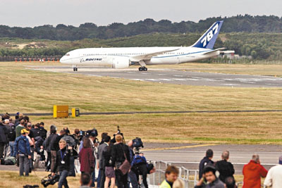 中新網(wǎng)7月19日電 綜合外電報道,倍受矚目的波音"787夢想客機"18日在英國范堡羅航空展首次亮相。這架美國制造的新型客機當天降落在英國,完成首次在美國以外的飛行之旅。