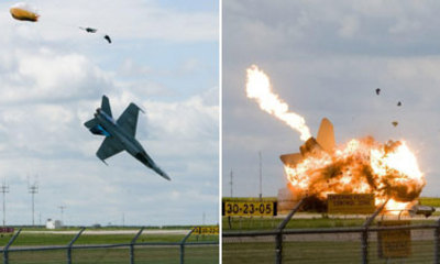 據(jù)悉,這架戰(zhàn)機(jī)是在做超低空飛行動(dòng)作時(shí)墜毀的。目擊者說(shuō),飛行員是在飛機(jī)離地面30米處被彈出機(jī)艙,拉開(kāi)降落傘成功逃生。