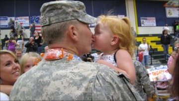 士兵杰森•艾夫舍德盡情享受著與妻子和孩子團聚的溫情。他說,過去的1年真是無比漫長的1年。妻子考特尼則無法抑制住淚水,她說:“我覺得這是種解脫,不用每天擔心他的安全,他可以每天晚上回到家里!