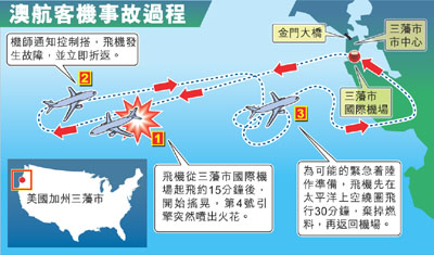 據(jù)報道,該架緊急降落的飛機為波音747-400客機,航班編號QF74,機上載著212名乘客和18名機組人員。飛機在當(dāng)?shù)貢r間9月1日晚11時05分從舊金山起飛,但航行了15分鐘后,機上乘客忽然感到極不正常,來自飛機右邊的強烈震動,坐在右邊的乘客大吃一驚。飛機一下子猛烈左轉(zhuǎn),有乘客赫然看到窗外有火焰噴出。機師不久后宣布客機需要緊急降落。
