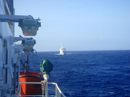 202船離釣魚島越來越近,而日本海上保安廳的大型巡邏船也增加到5艘。PL64船繼續(xù)跟著“中國漁政202”船,另4艘巡邏船PLH06、PLH09、PL03、PL65則排成一字形,隨202船的航向變化而動(dòng),始終擋在距離釣魚島12海里的所謂“警戒線”上,攔截著中國漁政船的去向。沈長嶺船長告訴記者,船在深海上要真正停在一個(gè)定點(diǎn)上是很難做到的,即使停了,船也會(huì)隨潮流漂移,而日本海上保安廳的這些大型巡邏船都裝有先進(jìn)的動(dòng)力定位系統(tǒng),可以準(zhǔn)確地保持在海上的某個(gè)定點(diǎn)上,且這些艦船的瞬間提速都很快!爸袊鴿O政202”船此后一直巡航到距離釣魚島12.8海里處。沈船長說,他們在護(hù)送“閩晉漁5179”返回晉江的途中還碰到過臺(tái)灣的保釣船和臺(tái)灣海巡署的船隊(duì),從之后的報(bào)道中了解到,它們被日本海上保安廳阻擋住的地方距離釣魚島還有十七八海里。