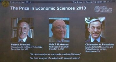 中新網(wǎng)10月11日電 據(jù)外電報(bào)道,瑞典皇家學(xué)院11日宣布,美國經(jīng)濟(jì)學(xué)家彼得·戴蒙德(Peter A. Diamond)、戴爾·默藤森(Dale T. Mortensen),塞浦路斯裔、英籍經(jīng)濟(jì)學(xué)家克里斯托弗·皮薩里德斯(Christopher A. Pissarides)三位學(xué)者共同獲得2010年諾貝爾經(jīng)濟(jì)學(xué)獎。