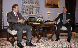 中新網(wǎng)10月11日電 據(jù)俄新網(wǎng)報道,11日,俄羅斯總統(tǒng)德米特里·梅德韋杰夫在戈爾基總統(tǒng)官邸接見美國加里福尼亞州州長阿諾·施瓦辛格。