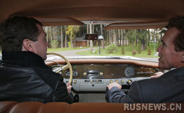 在短時間的交談之后,梅德韋杰夫和施瓦辛格坐上淺奶油色“海鷗”牌轎車,由梅德韋杰夫親自駕車,一起前往斯科爾科沃。