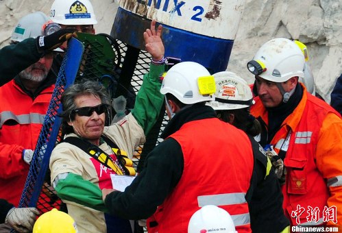 據(jù)報道,快到當(dāng)?shù)貢r間13日上午9點時,現(xiàn)年56歲的喬治.加利古洛斯(Jorge Galleguillos)順利升井,成為智利圣何塞銅礦第11名被營救出來的被困礦工。