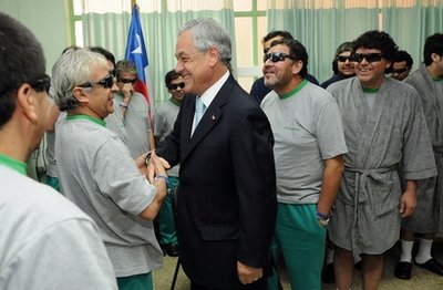 同時,智利總統(tǒng)皮涅拉在堅守礦井現(xiàn)場,迎接所有礦工逐一出井后,當(dāng)天前往礦工所在醫(yī)院進行探望。他與礦工們握手交談,對他們重獲新生表示祝賀。