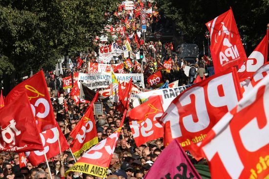 在薩科奇的親自推動(dòng)下,法國(guó)這一輪的退休制度改革搞得如火如荼,總理菲永領(lǐng)導(dǎo)下的內(nèi)閣所提出的改革方案中最重要的內(nèi)容,已經(jīng)在9月份獲得法國(guó)國(guó)民議會(huì)(眾議院)通過(guò),參議院也已經(jīng)在本月8日通過(guò)了提高退休年齡的法案,其余部分將在今日進(jìn)行最后表決。法國(guó)工會(huì)和學(xué)生發(fā)起聲勢(shì)浩大的全國(guó)性罷工和示威,就是想趕著表決之前,盡最大的努力加以阻止,就像1995年的那次致使全國(guó)交通運(yùn)輸系統(tǒng)癱瘓的大罷工,最終迫使希拉克政府不得不取消了養(yǎng)老金改革。