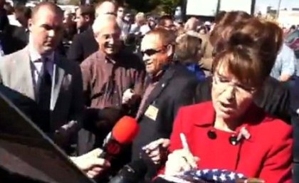 佩林在出席集會(huì)時(shí),支持者遞給她帽子、球衣和書籍以獲得簽名。而當(dāng)有人遞上國(guó)旗時(shí),她也毫不猶豫的用記號(hào)筆在旗面上揮筆寫下自己的名字,而后還揮動(dòng)國(guó)旗并將其送還給支持者。
