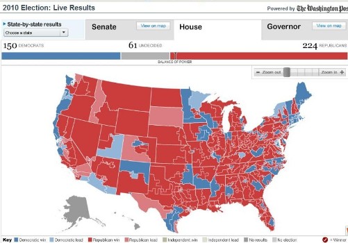 據(jù)報道,美國2010年中期選舉大部分州已經(jīng)結束投票,最新出口民調(diào)結果顯示,共和黨在眾議院435議席中已獲過半席位,重新掌控眾議院。