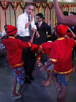 這些身穿鮮艷印度傳統(tǒng)服裝的孟買學(xué)生,當(dāng)天為遠(yuǎn)道而來的客人表演慶祝排燈節(jié)的舞蹈,他們搖擺著身姿,配以優(yōu)美的手勢,感染著在場的觀眾。孩子們邀請奧巴馬夫人米歇爾一起舞蹈,米歇爾熱情的加入,奧巴馬則在一旁靜靜觀看。不過最后,奧巴馬也被拉起來共舞,但有些呆板生硬的動作令人忍俊不禁。
