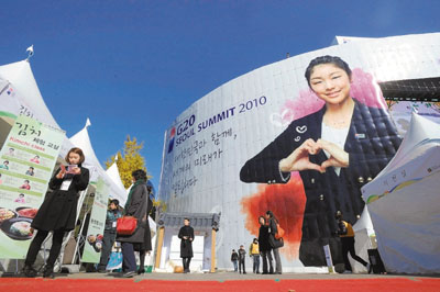 峰會(huì)主辦方別出心裁,推出峰會(huì)宣傳大使,是G20峰會(huì)歷來(lái)第一次。結(jié)果,冬奧會(huì)金牌得主、當(dāng)紅滑冰選手金妍兒和足球運(yùn)動(dòng)員樸智星,以及憑《燦爛的遺產(chǎn)》竄紅的韓孝珠當(dāng)選。