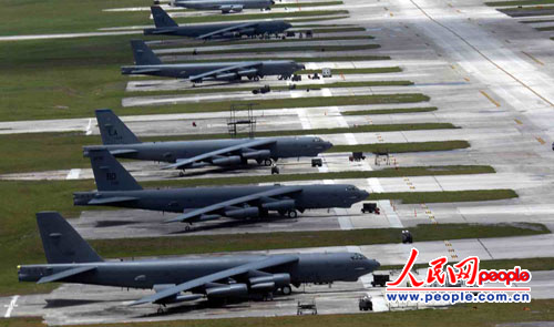 目前美海、空軍在關(guān)島部署了大量的先進(jìn)武器裝備。美空軍在關(guān)島組建了一個(gè)“全球打擊特遣隊(duì)”,包括6架B-2隱形轟炸機(jī)、12 架KC-135空中加油機(jī)、48架F-15E戰(zhàn)斗機(jī)和1架“全球鷹”無(wú)人偵察機(jī)。同時(shí),美國(guó)最先進(jìn)的隱形戰(zhàn)斗機(jī)“猛禽”F-22還定期飛往關(guān)島駐訓(xùn),且未來將永久部署關(guān)島。