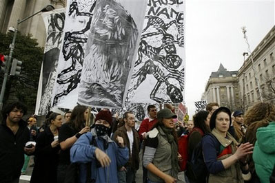 華盛頓的示威者打算“封鎖”國家稅務(wù)局,另一些示威者則會設(shè)法阻止K街的“發(fā)戰(zhàn)爭財者”。K街是華盛頓公司游說者的大本營。