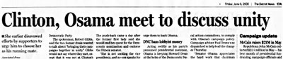 中新網(wǎng)6月8日電 美國前日出版的報章《底特律新聞》,約4.5萬份報紙的17A頁上,標(biāo)題寫錯成《希拉里、奧薩瑪會面商團(tuán)結(jié)》(見圖),把民主黨總統(tǒng)選舉準(zhǔn)候選人奧巴馬(Obama)的名字,錯拼做“基地”恐怖組織領(lǐng)袖奧薩瑪(Osama)•本•拉登。