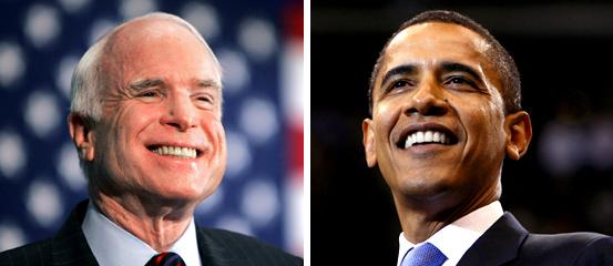 美國共和黨總統(tǒng)競(jìng)選人麥凱恩(左)與民主黨總統(tǒng)競(jìng)選人奧巴馬(右)。