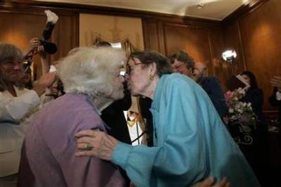 據(jù)美國《明報》報道,66歲的泰勒跟54歲同志情人奧爾森,多年來一直爭取同性婚姻權(quán)利,正是他們的上訴,最終促成加州最高法院推翻州政府的同性婚姻禁令。兩人已準(zhǔn)備在16日下午5點01分結(jié)婚,成為洛杉磯縣區(qū)首對正式同志“夫妻”。泰勒說﹕“我們準(zhǔn)備在法院外結(jié)婚,因為這是我們多年來斗爭的地方,在這兒結(jié)婚宣布‘我們勝利’,無疑是美妙的事!痹诩又萃緞俚匚骱萌R塢,有酒店表示,在最高法院上月裁定同性婚姻合法后,入住率不斷攀升,“我們17日的房間差不多已經(jīng)訂滿,未來一周也差不多。以往我們的入住率不會這樣高!