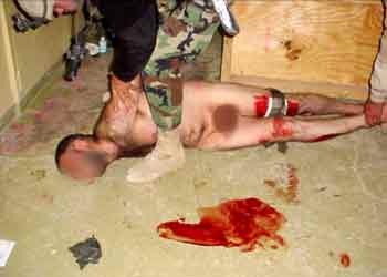 美軍在阿布格拉布監(jiān)獄對(duì)囚犯拳打腳踢。