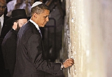 據(jù)香港《文匯報(bào)》報(bào)道,哭墻有2000年歷史,是猶太教的圣地,不少人都會(huì)把寫(xiě)著禱文的紙條塞進(jìn)石縫。奧巴馬會(huì)晤以色列和巴勒斯坦自治政府的官員后,周四凌晨戴著卡巴頭飾到訪哭墻,留下紙條,之后便垂下頭,作為敬拜。