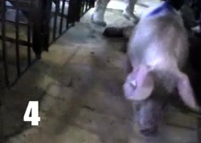 視頻截圖顯示:一頭受傷的母豬在遭宰殺前被強迫行進。