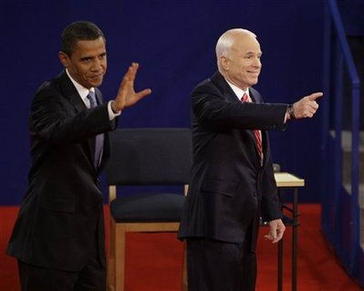 麥凱恩和奧巴馬在第二場(chǎng)辯論前向觀眾揮手致意。