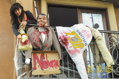另外3宗同類(lèi)事件亦有一宗發(fā)生在校園內(nèi),本月在俄勒岡州喬治福克斯大學(xué)內(nèi),4名學(xué)生因同樣在樹(shù)上吊起奧巴馬人像而被學(xué)校處分。此外,加州發(fā)生兩宗分別問(wèn)吊奧巴馬和佩林像的事件,其中有名女子把奧巴馬人像吊到露臺(tái)上,更用豬肉刀插進(jìn)人像的脖子中。