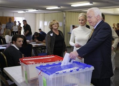中新網(wǎng)11月5日電 據(jù)法新社報(bào)道,美國共和黨總統(tǒng)候選人麥凱恩4日在妻子辛迪的陪同下在亞利桑那州進(jìn)行了投票。