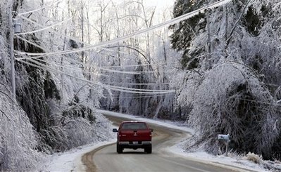 12月14日,緬因州,一輛卡車駛過兩側樹木被冰覆蓋的車道。