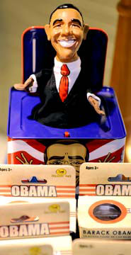 自當(dāng)選總統(tǒng)的那一刻起,奧巴馬就成了商家的“搖錢(qián)樹(shù)”。隨著支持他的呼聲越來(lái)越高,各種以他為原型的商品層出不窮。T恤、籃球、棒球帽、戒指、鑰匙扣、筆、杯子應(yīng)有盡有。在大街小巷,隨處可以看到和奧巴馬有關(guān)的小物品,諸如香煙、拳擊短褲、熱狗、高爾夫球、唇膏、腕表等,各色各樣,琳瑯滿目。
