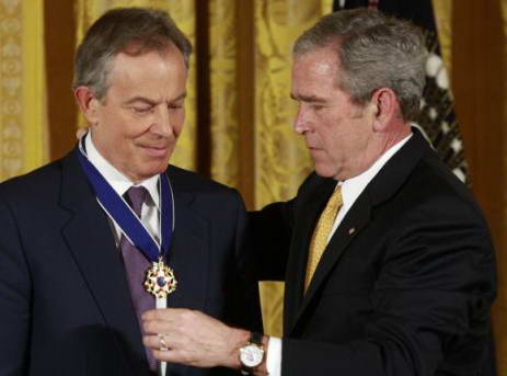 布什稱,布萊爾是美國(guó)“真正的朋友”,布萊爾非常堅(jiān)韌地應(yīng)對(duì)了歷史的挑戰(zhàn),做出了一個(gè)國(guó)際政治家的榜樣。布什稱:“布萊爾相信自由,相信免于壓迫的自由、免于饑餓的自由、免于疾病的自由、免于恐懼和絕望的自由。他雖然已卸任,但仍積極參加公眾事務(wù)。布萊爾仍然是一位擁有很高智力和遠(yuǎn)見的人士。最重要的是,他是一位有信仰的人,是一位理想主義者,是一位正直的人。”布什總統(tǒng)13日還向哥倫比亞總統(tǒng)烏里韋、澳大利亞前總理霍華德頒發(fā)了“總統(tǒng)自由勛章”。布什在8年的總統(tǒng)生涯共頒發(fā)了78枚總統(tǒng)自由勛章。