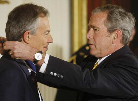 據(jù)英國(guó)《每日郵報(bào)》報(bào)道,美國(guó)總統(tǒng)布什13日向英國(guó)前首相布萊爾頒發(fā)了總統(tǒng)自由勛章。這一勛章是美國(guó)授予平民的最高榮譽(yù)。