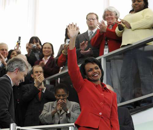 美國國務院十六日舉行了一場告別會,國務院全體職員均有出席。會上國務卿賴斯發(fā)表了一段主題為保衛(wèi)全球自由民主的重要性的簡短演說。然后,她向下屬們說:“你們永遠都會留在我的腦海里、我的禱告里和我的心里!碑敃r她面露微笑,但眼里泛著淚光,而且說話的聲音哽咽。語畢,臺下向她報以熱烈的歡呼和掌聲,她則步下臺階,與各個大使、外交官、安全官員等逐一握手并拍照留念,然后步出大門。