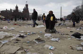 日前美國將使用衛(wèi)星在空中拍攝到華盛頓國家廣場照片,和奧巴馬總統(tǒng)就職后的進行對比。從照片上可以看到在就職典禮當(dāng)日,國家廣場上覆蓋了白色垃圾,這些垃圾大部分是宣傳紙、報紙、塑料瓶子、食物包裝紙、一次性咖啡杯,甚至還有美國國旗。