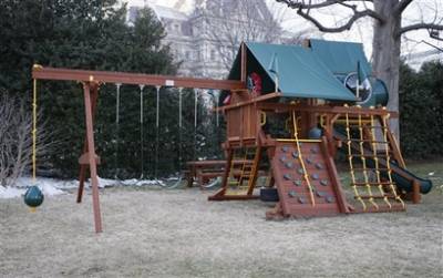 這套木制滑梯、秋千及攀爬套裝,是由美國(guó)紅木及香柏木所制,由南達(dá)科他州一間公司制造,符合奧巴馬推動(dòng)的環(huán)保政策原則。暫時(shí)未悉這個(gè)迷你游樂場(chǎng)花了多少錢建造。