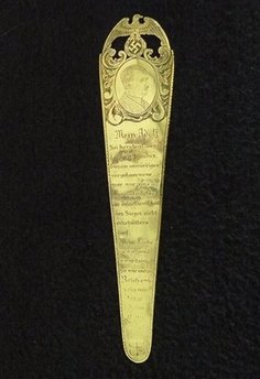 據(jù)稱,這枚金書(shū)簽具有特殊的歷史價(jià)值,它是希特勒的情人愛(ài)娃1943年送給希特勒的禮物,書(shū)簽上方雕刻著希特勒的臉,此外還有棲息在納粹十字記號(hào)上的鷹圖案,書(shū)簽上的題字還提到了1943年1月31日德軍在斯大林格勒戰(zhàn)敗后向前蘇聯(lián)軍隊(duì)投降的事件,因此,有人認(rèn)為愛(ài)娃送希特勒這枚書(shū)簽是為了安撫希特勒當(dāng)時(shí)沮喪的心情。